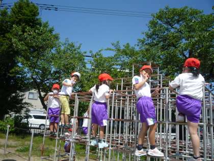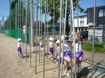 青空のもと、遊具遊びに取り組んでいます。ジャングルジムや登り棒では、高い所まで登ることができ大喜びです。