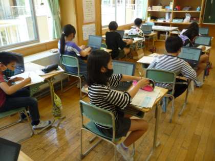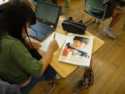 パソコンを使って天気についてのデーターを調べ、そこから考えたことをノートに書き込んでいます。