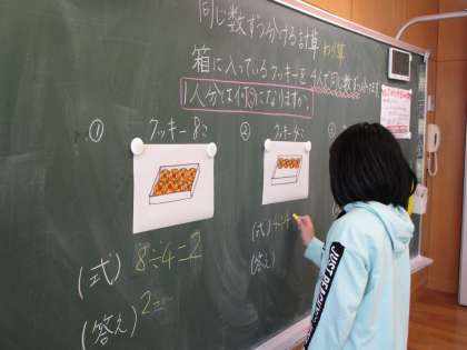 3年生は、わり算の学習で一人分の数を求めました。わられる数が0になっても慌てずに計算することができました。