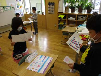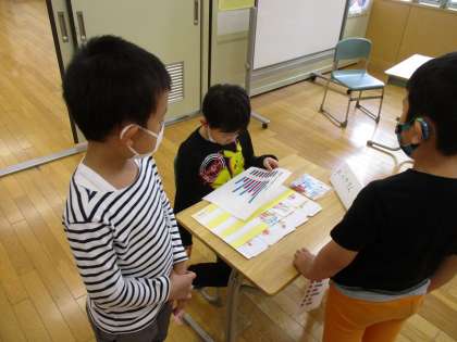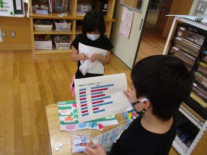 にこにこの時間に、お買い物の学習をしています。お店屋さんやお客さんになりきり、商品を売ったり買ったりしています。始めたばかりなので紙を見ながら、練習しています。