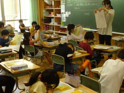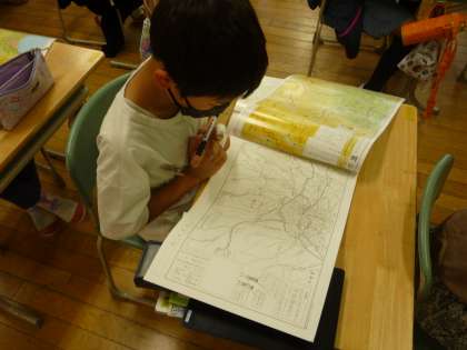 富山市の白地図で、山室小学校を見つけています。「あった!」と指で指して、教えてあげている子供も