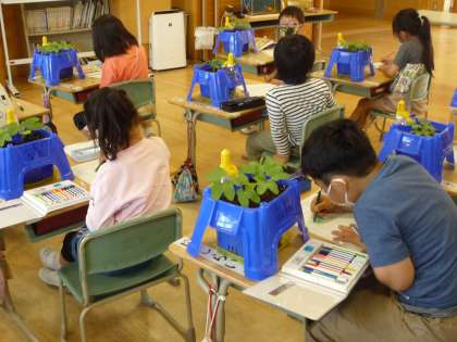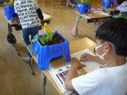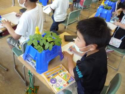 アサガオの観察です。大きくなったアサガオの様子をじっくり観察して、観察日記に書きました。