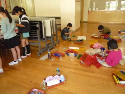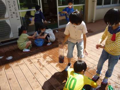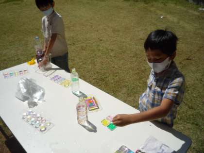 「光のプレゼント」の学習では、透明な袋に色水を入れたり、ペットボトルの水の中にセロハンを入れたりして、光のプレゼントを楽しんでいます。