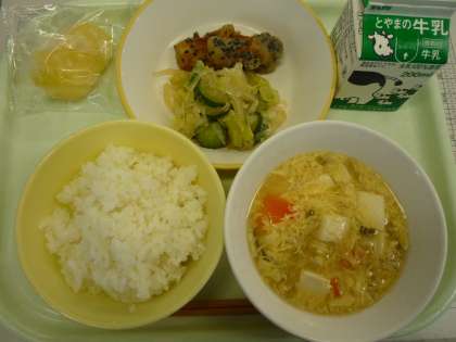 ごはん ちくわの南部揚げ はるさめサラダ かき玉汁 冷凍リンゴ 牛乳