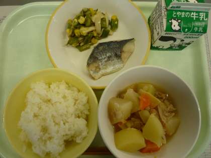 ごはん 鰆の塩焼き アスパラソテー じゃがいもと豚肉のみそ煮込み 牛乳