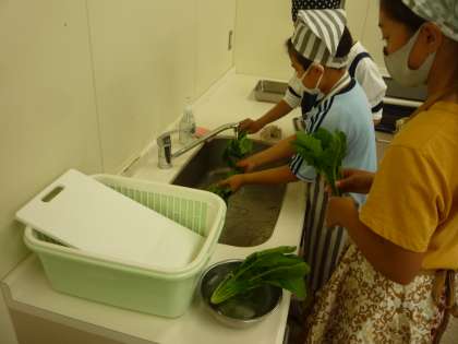 ほうれん草を茹でて、おひたしを作ります。野菜の上手な茹で方に挑戦です。