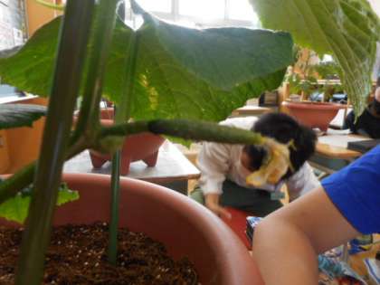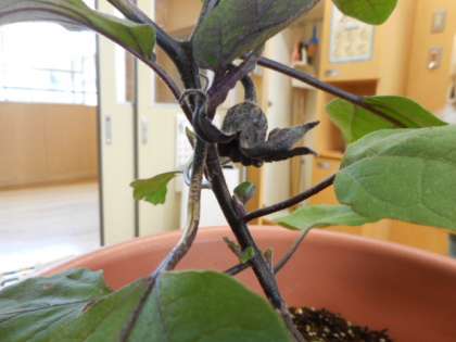 子供たちがお世話している野菜に実がなりました。まだまだ小さくて、トマトは青いのですが、実がなったことに大喜びの子供たち。食べられる大きさになるまで、毎日水やりをしましょうね。