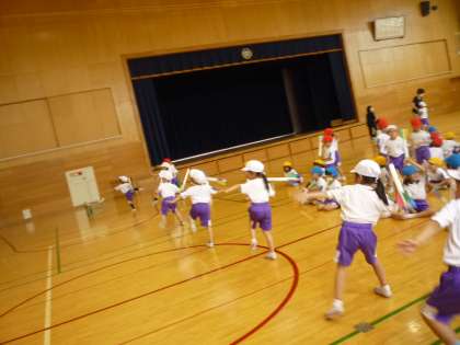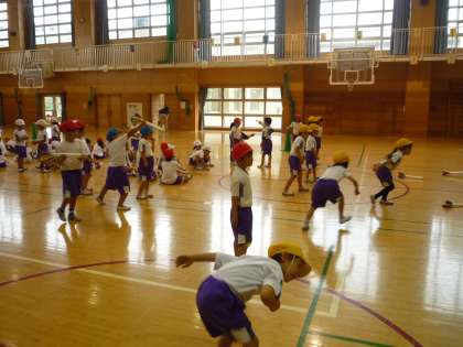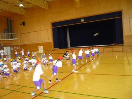ソフトボール投げの練習では、ロケットのような練習用具を使って練習しました。
