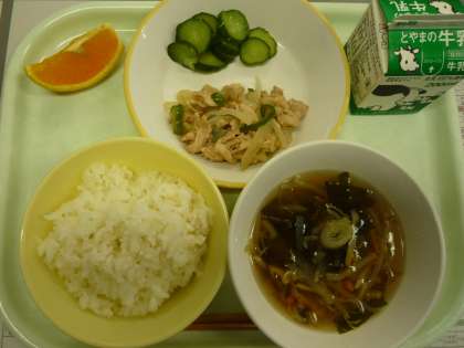 ごはん 豚肉のしょうが焼き きゅうりもみ わかめスープ バレンシアオレンジ 牛乳
