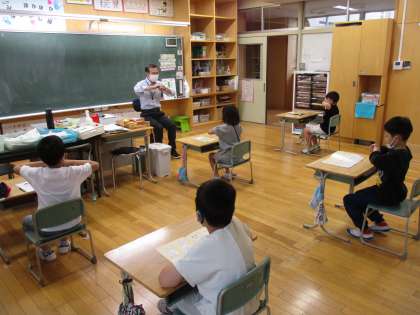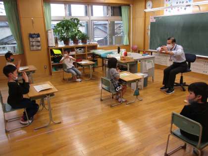 書写の時間には、書写体操をしてから文字を書いています。書写体操で指や体をほぐしてから、正しい姿勢で落ち着いて文字を書いています。今日は、しりとりもしました。たくさんの言葉をつないで、楽しく学習しました。