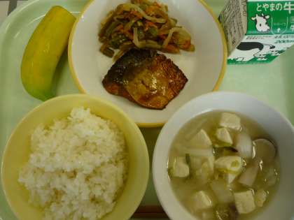 ごはん さばの照焼き 茎わかめのきんぴら 豆腐のみそ汁 バナナ 牛乳