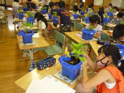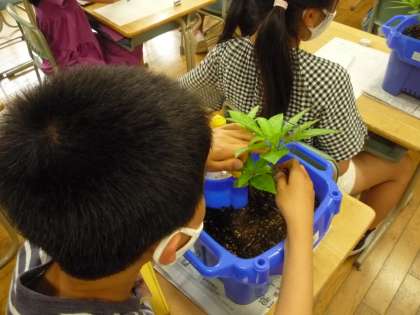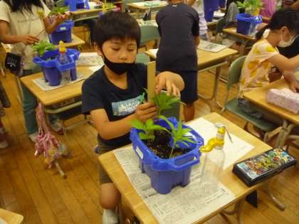 ホウセンカの観察の様子です。物差しを使って背丈を測ったり、葉や茎の様子をじっくり観察したりしています。