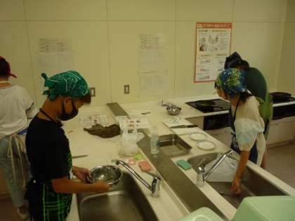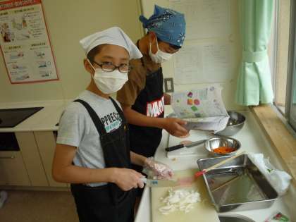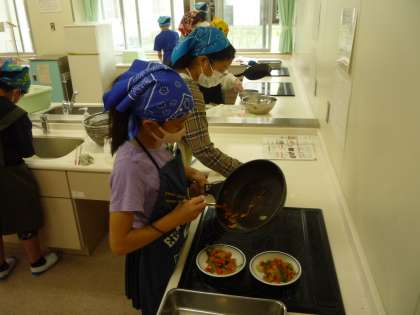 今日は野菜炒めに挑戦しました。手際よく野菜を切ったり、炒めたりする姿が何人も見られます。