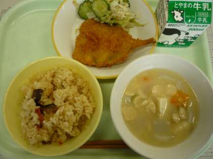 五目ごはん あじフライ きざみ和え 打ち豆汁 牛乳