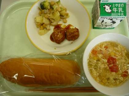 米粉コッペパン ミートボール ひよこ豆のオリーブオイル炒め 卵とレタスのスープ 牛乳