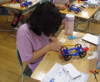 3年生は、理科で風やゴムの働きについての学習が始まりました。写真は、実験用の車を組み立てているところです。
