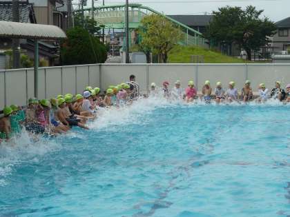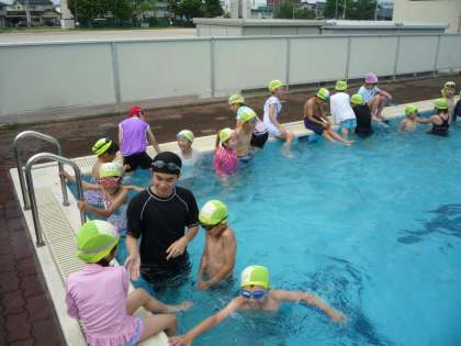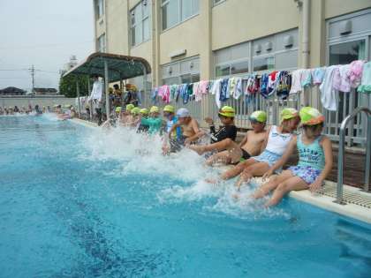 まず始めに、水慣れでプールサイドに腰掛けて、バタ足の練習をしました。
