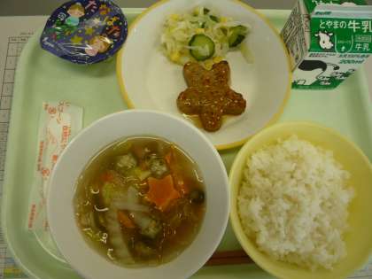 ごはん 星形ハンバーグ コーンサラダ 天の川スープ 七夕デザート 牛乳