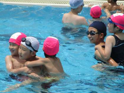 深くて大きなプールにドキドキしていた1年生ですが、6年生が優しく手をつないだりおんぶしてくれたりしたおかげで、笑顔で入ることができました。「地獄のシャワー」と言われる冷たくて勢いのよいシャワーにも頑張って入ることができました。天気もよくて、気持ちよく入りました。