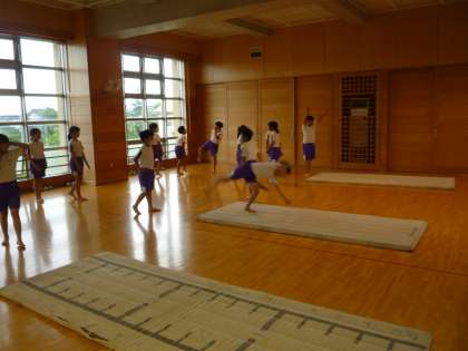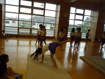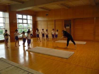 側方倒立回転に挑戦しました。先生がお手本を見せてくれました。