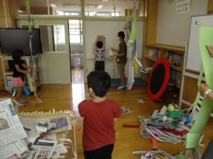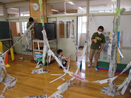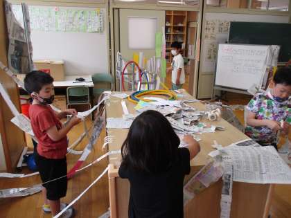 学習参観で図画工作科「つないで つるして」の学習を公開しました。次の日、もう一度みんなで続きの学習をしました。何度もつくるうちに「ここは重くなるから、もっと強く貼ろう」「届かないところ、手伝って〜。」と工夫する姿や協力する姿がたくさん見られました。楽しく活動できました。