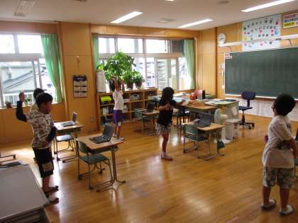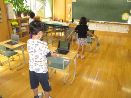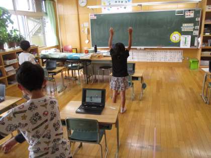 クロムブックに、ラジオ体操の動画をアップしました。子供たちは、クロムブックで動きを確認しながら、ラジオ体操第一、第二の体操に挑戦しました。動きが速くて、難しい所がいくつもありましたが、楽しく運動することができました。プール学習の準備運動や、夏休みのラジオ体操などに参加していきたいです。