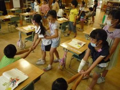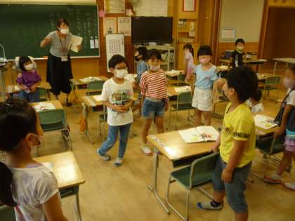 「おおきなかぶ」の学習では、大きな声で音読したり、かぶを抜く場面を動作化したりして、楽しく学習に取り組んでいます。