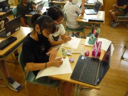環境をテーマに学習を進めています。絶滅危惧種について調べたり、エコ活動について調べたりして、自分のテーマを考えています。