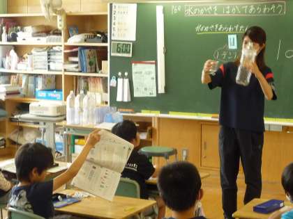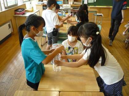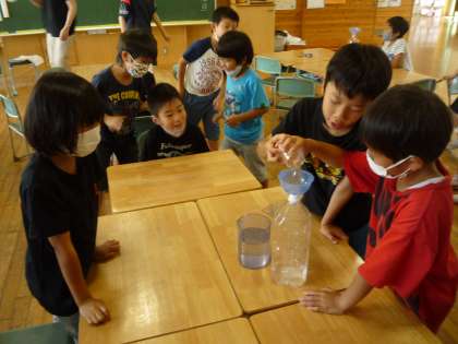 1Lのペットボトルに何dlの水を入れることができるか、dl升を使って調べいます。机の上に水がこぼれていますが、正確に測れているでしょうか?!