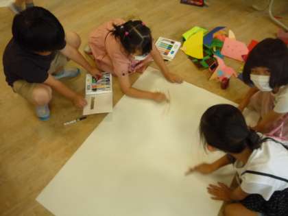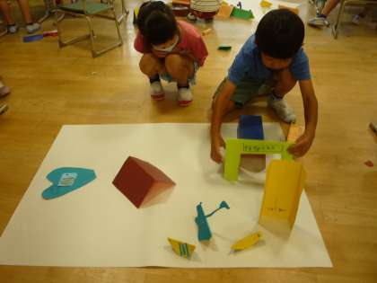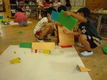 「おってたてて」の学習では、グループで一つの作品を作っています。模造紙の上に自分の作った作品を立ててみて、想像した町を作っています。