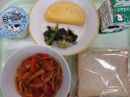 食パン ツナとトマトのスパゲッティ オムレツ 海藻サラダ ヨーグルト 牛乳