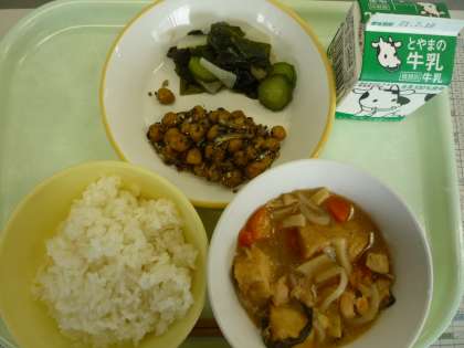 ごはん 厚揚げの中華煮込み 小魚入りフライビーンズ 酢の物 牛乳