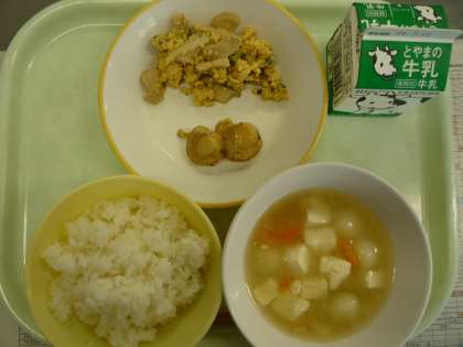 ごはん ほたての香味焼き ゴーヤの卵炒め 白玉汁 牛乳