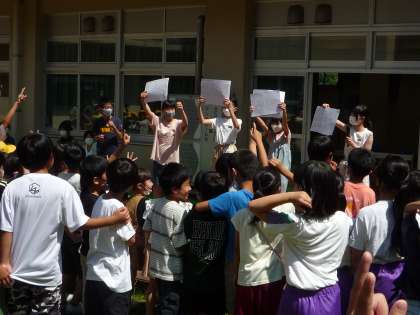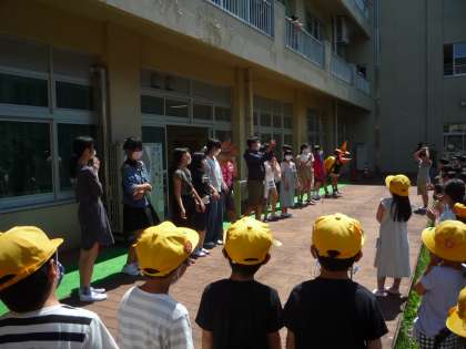 中庭に集まったり、ベランダから眺めたりして、久しぶりの集会をおもいっきり楽しむ姿が見られました。