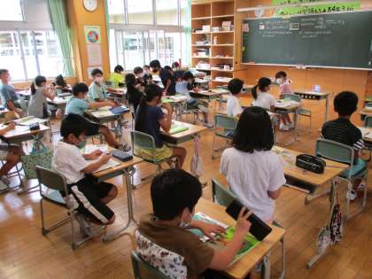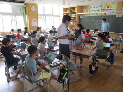 社会では、Chromebookを活用して、考えを伝え合おうとしています。理科では、考えをノートにまとめています。
