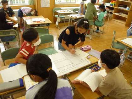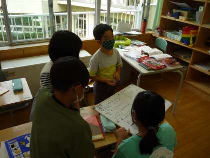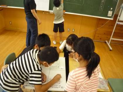 ホワイトボードを使ってグループの考えをまとめ、発表します。みんな活発に意見を交換しています。