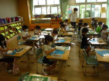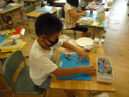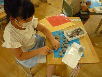 粘土カッターを包丁に見立てて、実際に料理をしている気分になっています。