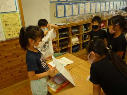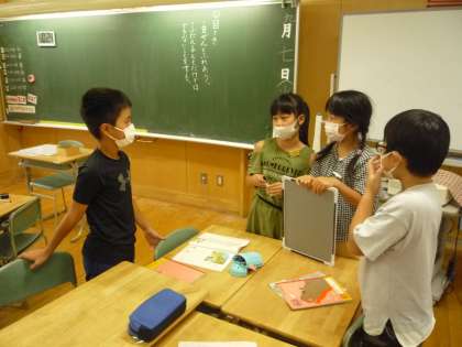 グループで考えたことをホワイトボードにまとめ発表しました。クロムブックやホワイトボードを状況に応じて活用しています。