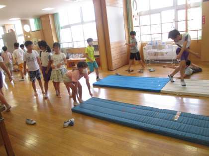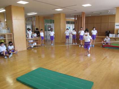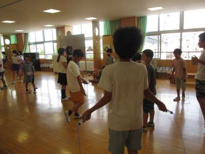 オープンスペースを利用して、体力つくりに取り組みました。今日は、ゴム跳び、なわとび、立ち幅跳びの3種類の「跳」の運動をしました。