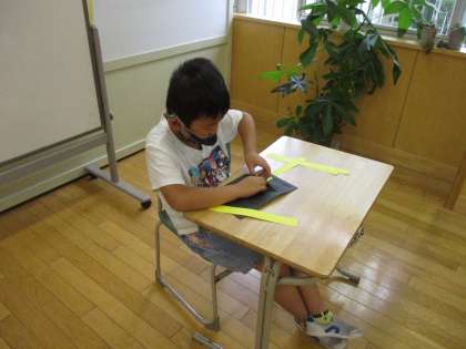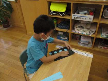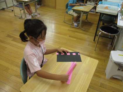 紙を縦と横にくぐらせて模様をつくりました。黒の隣が色になるように、規則正しい模様をつくります。「次はどっちの色になる?」と考えながら、集中して取り組みました。