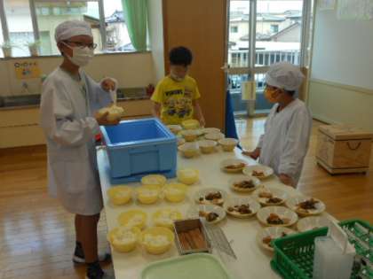 2学期からなかよし級とひまわり級合同で給食の準備をしています。エプロン、帽子を付けて、人数のご飯とおかずをよそいます。決められた数通りに、多い少ないがないように量に気を付けて、配っています。