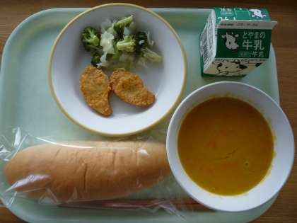 コッペパン、チキンナゲット、フレンチサラダ、かぼちゃポタージュ、牛乳