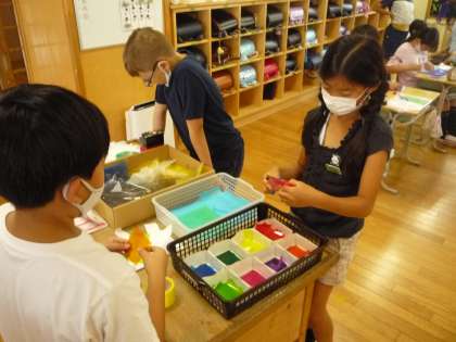 ステンドグラス作成中です。茶色を作るには、どの色のセロハンを組み合わせればよいのか思案中です。