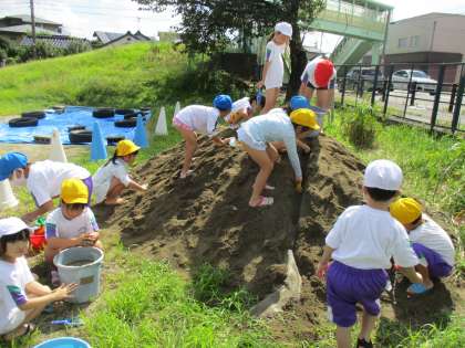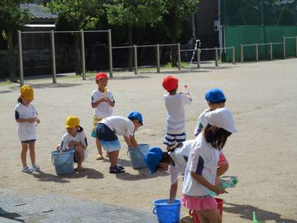 1年生みんなで、水遊び、シャボン玉遊び、泥遊びをしました。天気に恵まれ、仲良く楽しみました。