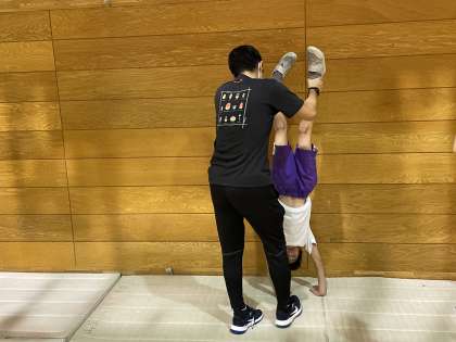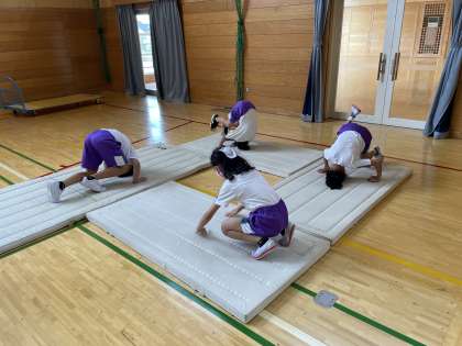 体育ではマット運動の学習が始まっています。いろいろなコースがあり、体づくりや壁倒立をがんばっているところです。