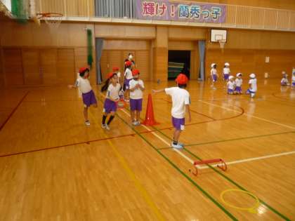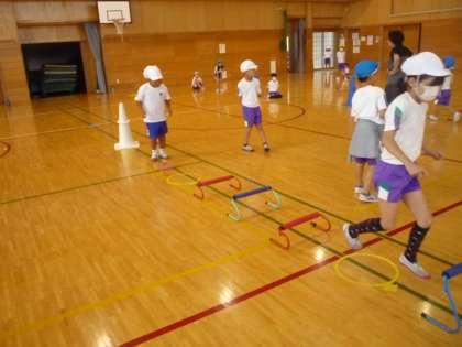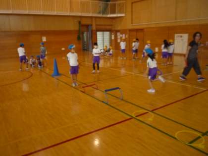 ミニハードルやフラフープを並べて、折り返しリレーを行いました。並べ方はグループで工夫しました。