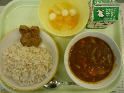 麦ごはん 十五夜ハンバーグカレーライス フルーツ白玉 牛乳