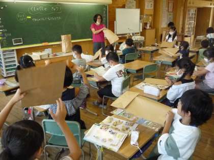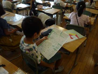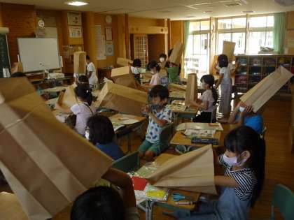 「くしゃくしゃ ぎゅっ」の学習が始めました。紙袋を頭にかぶったり、空気を入れてみたりとこれから作るもののイメージを広めています。