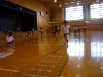 走り幅跳びの練習です。踏切の足や助走の仕方を工夫しながら練習しています。