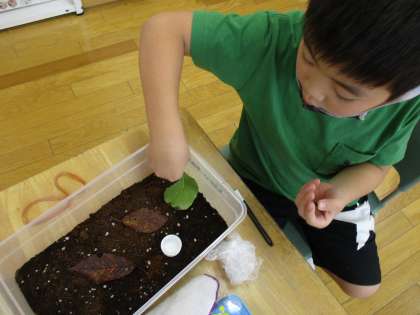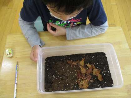 学校でつかまえたダンゴムシのお世話が始まりました。飼育ケースで、自分のダンゴムシのお世話をがんばっています。ダンゴムシは「しめっているところが好き」なので、霧吹きで水もあげました。「赤ちゃんが生まれるといいなあ」と、つぶやきながらえさをあげていました。